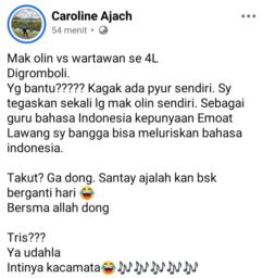 EMPAT LAWANG – Seorang oknum guru Bahasa Indonesia di SMPN 5 Tebing Tinggi, Kabupaten Empat Lawang berinisial CA (pemilik akun Facebook Caroline Ajach) menuai kecaman luas dari kalangan jurnalis. Hal ini dipicu oleh unggahan dan komentar sang guru yang dinilai merendahkan profesi wartawan, meski dirinya sendiri kedapatan melakukan kesalahan dasar dalam berbahasa.